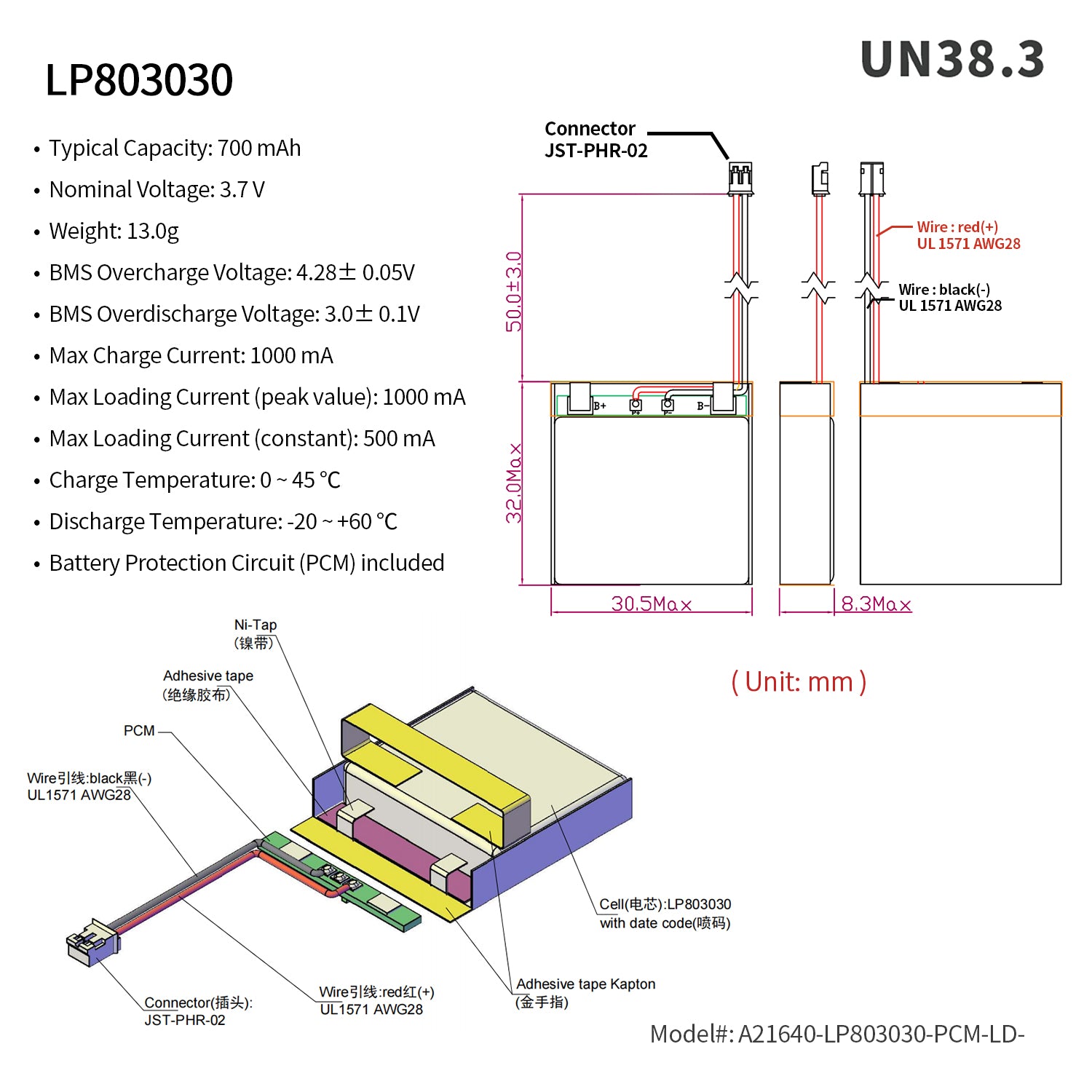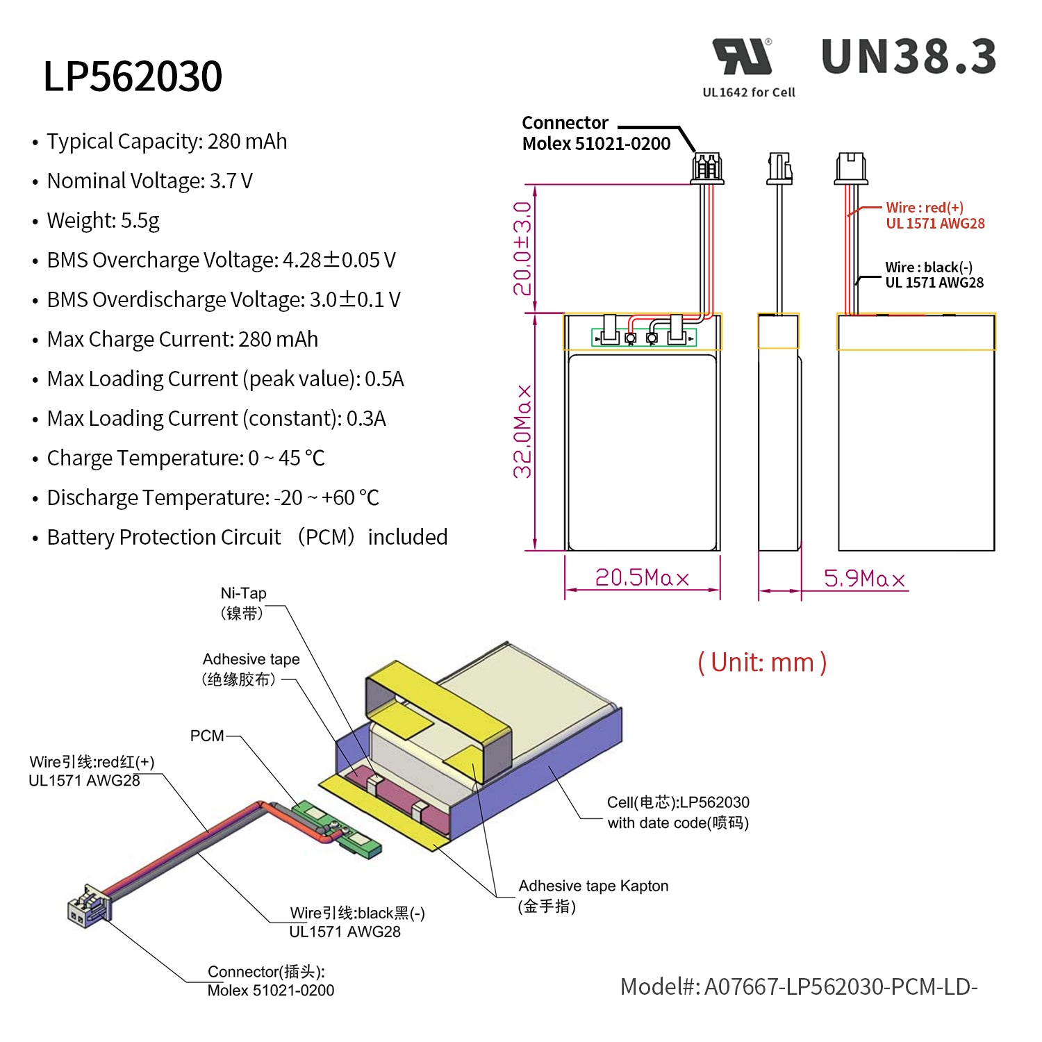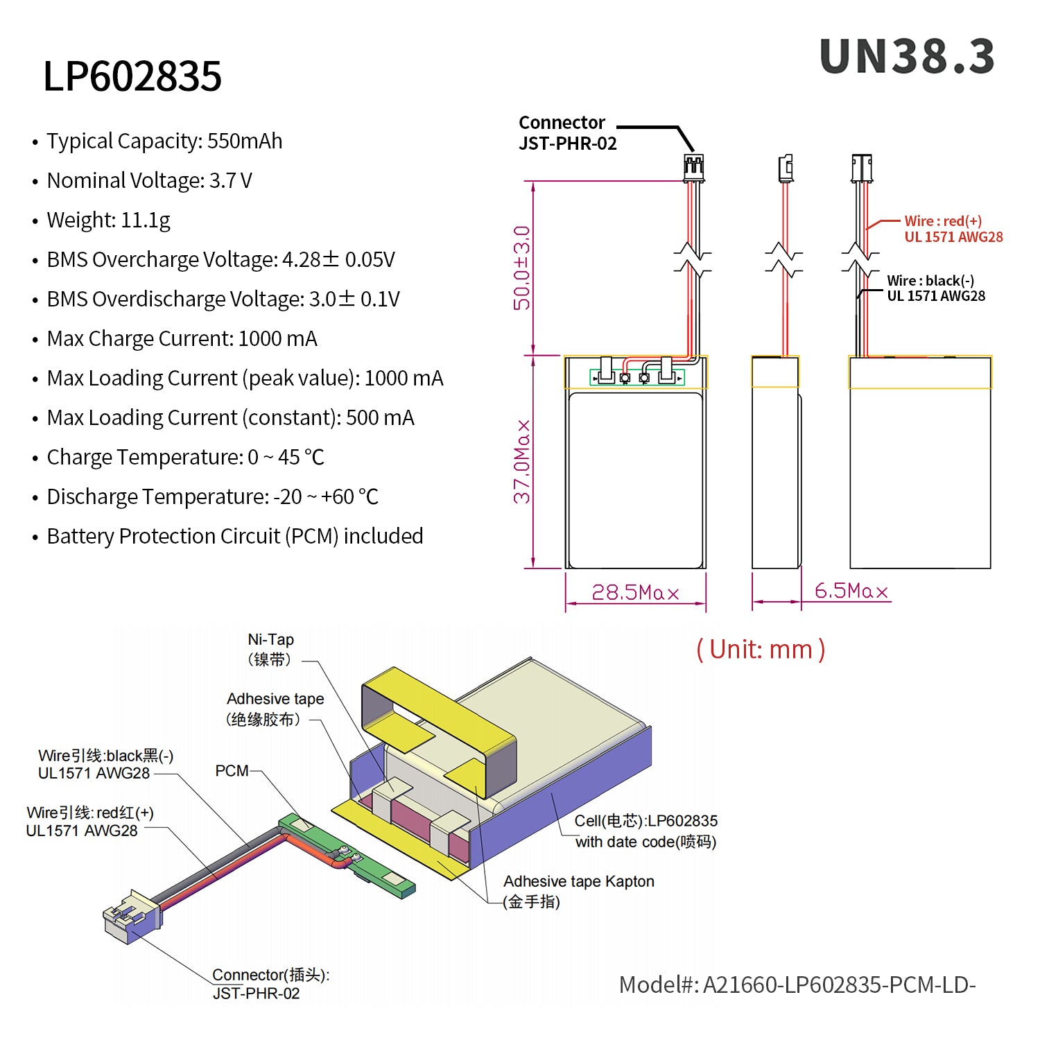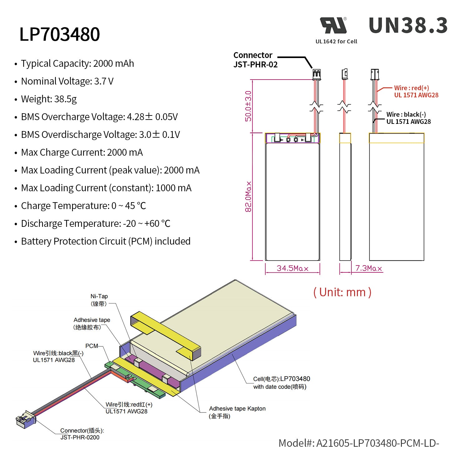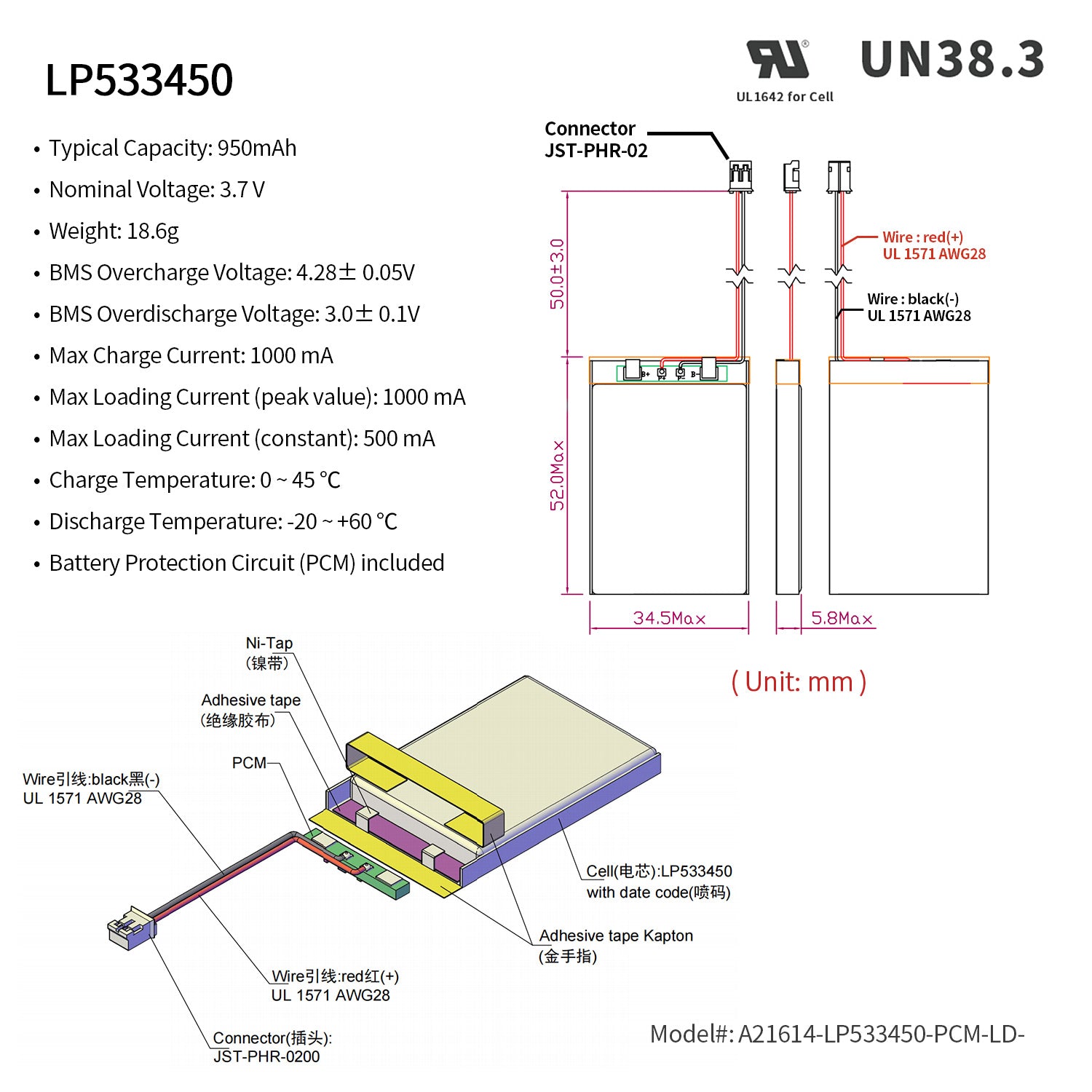 Rechargeable Li-ion Polymer battery. Nominal voltage of 3.7V