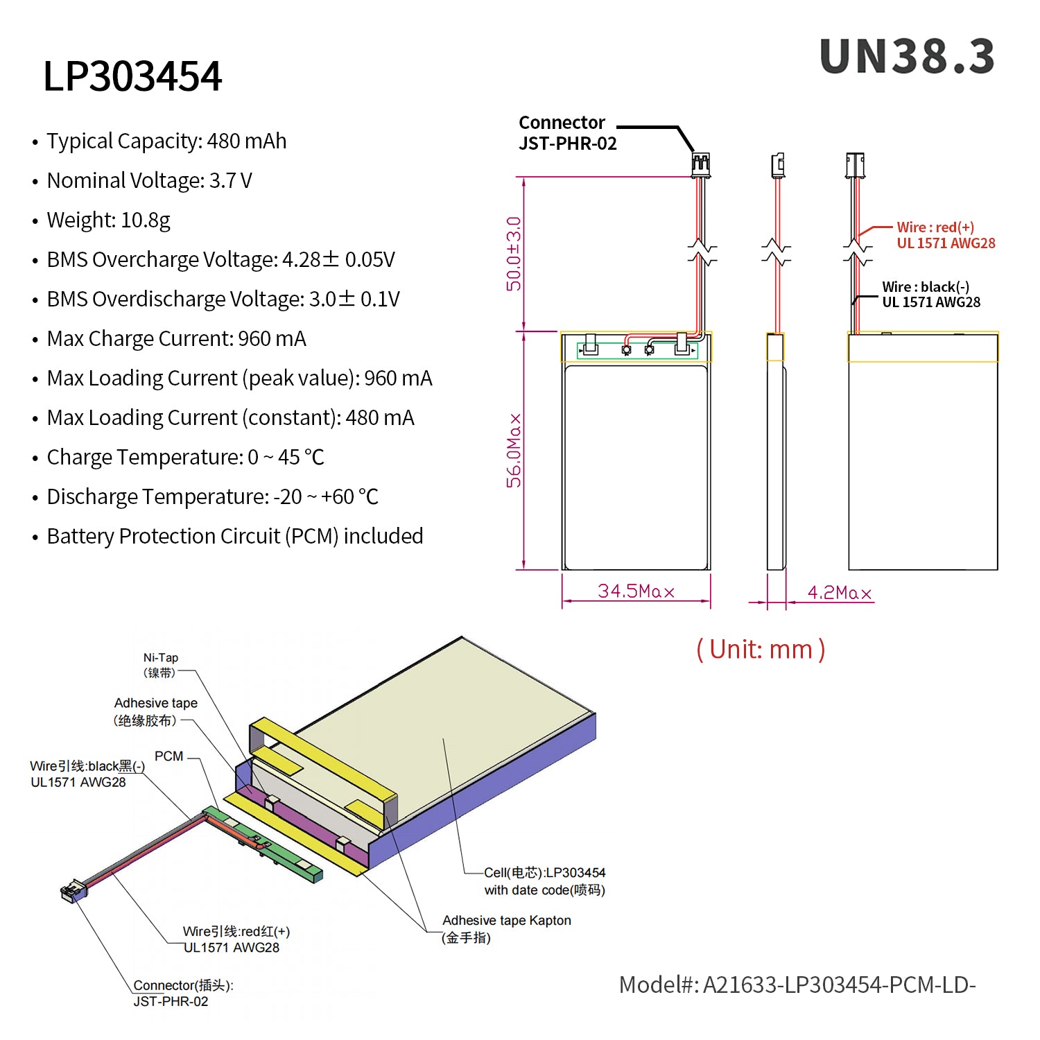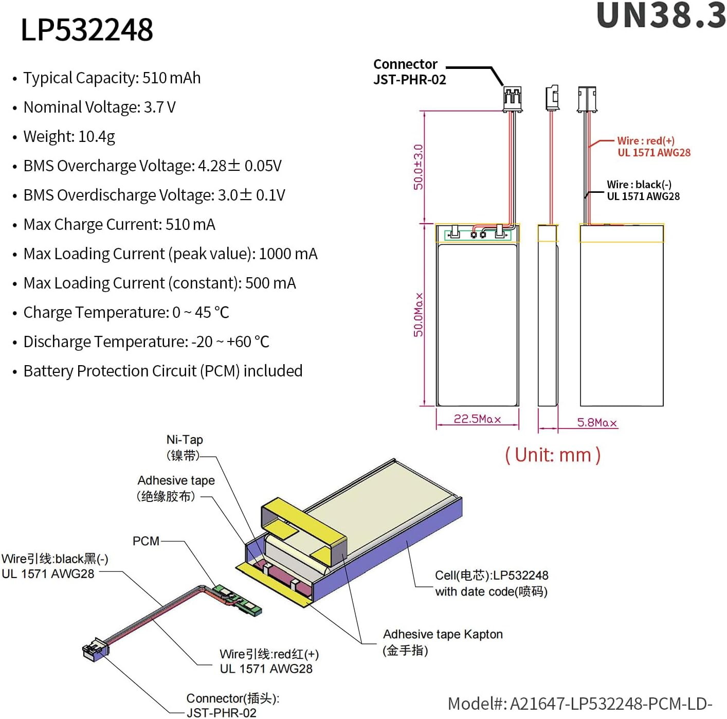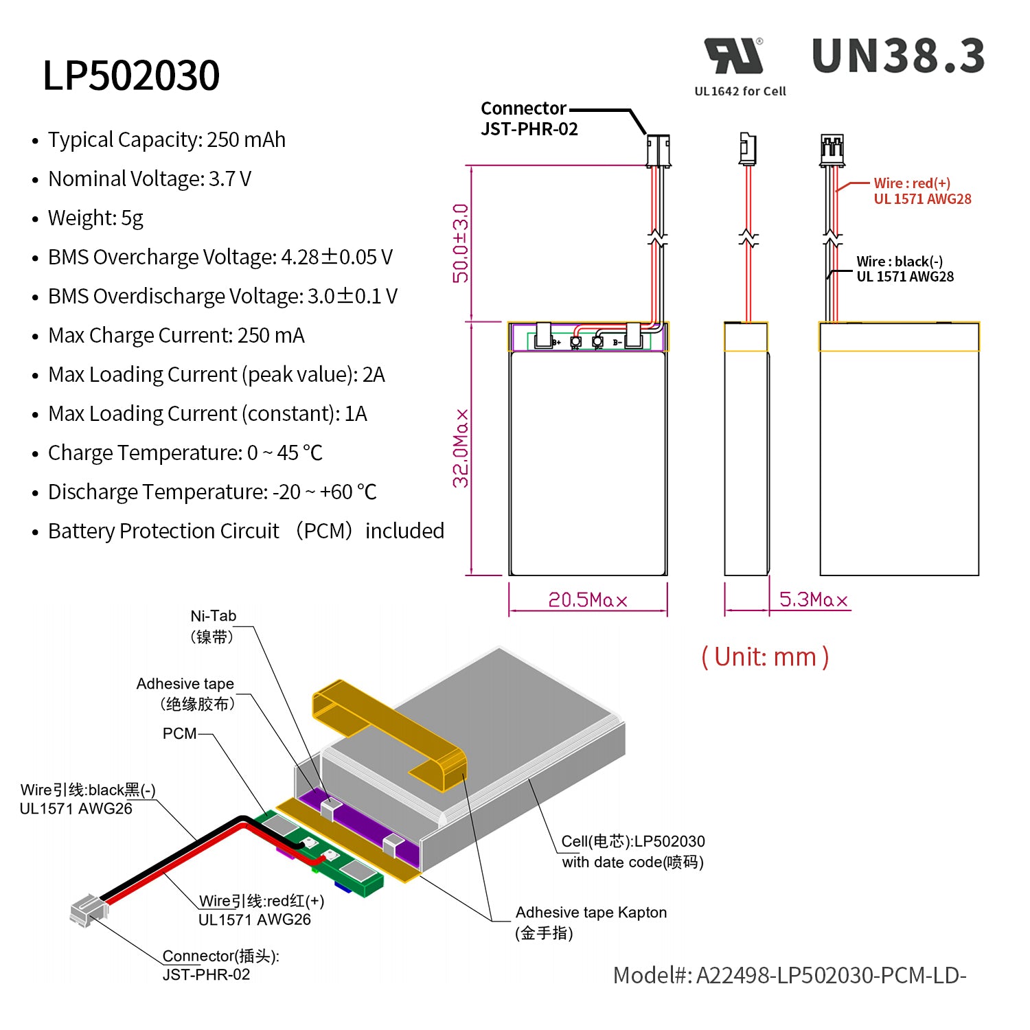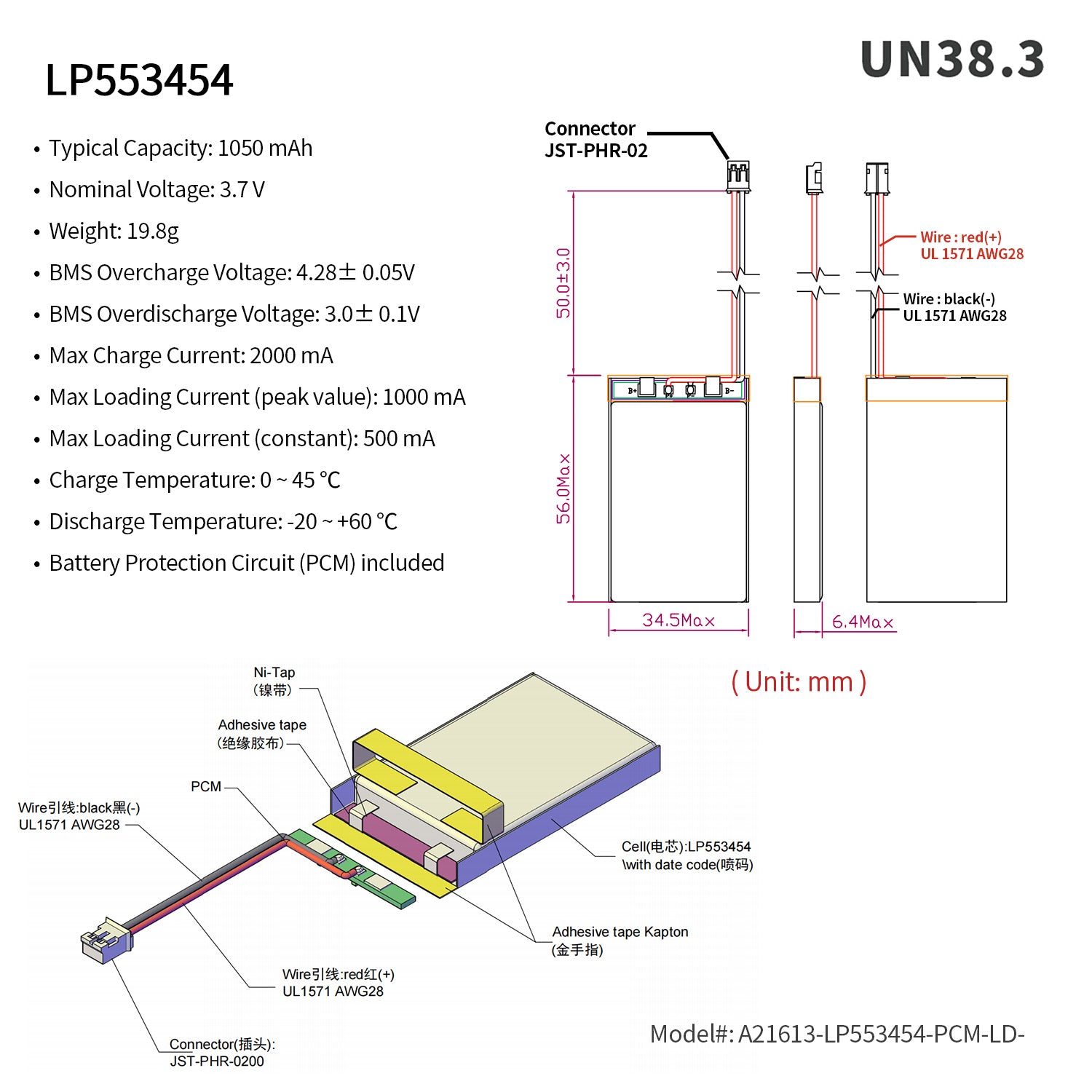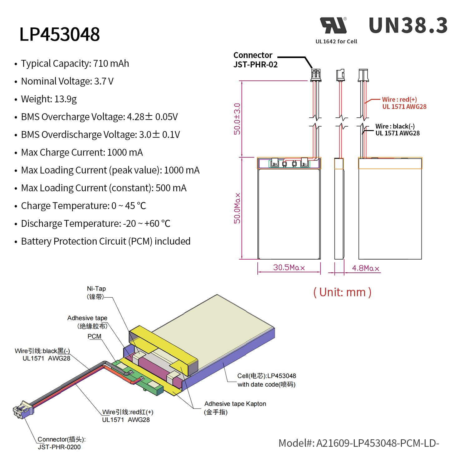 Rechargeable Li-ion Polymer battery. Nominal voltage of 3.7V